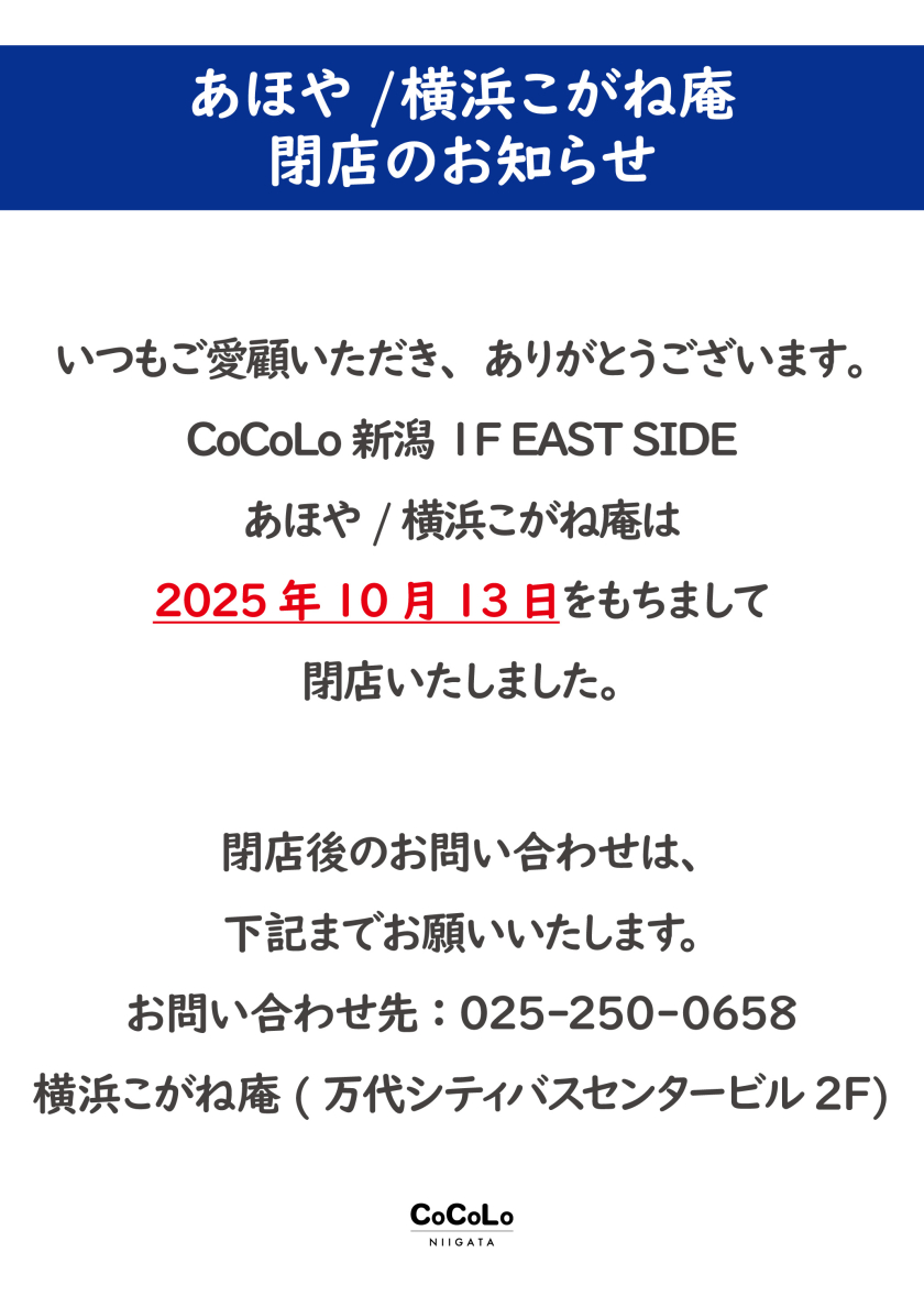 CoCoLo新潟1F EAST SIDE「あほや/横浜こがね庵」は