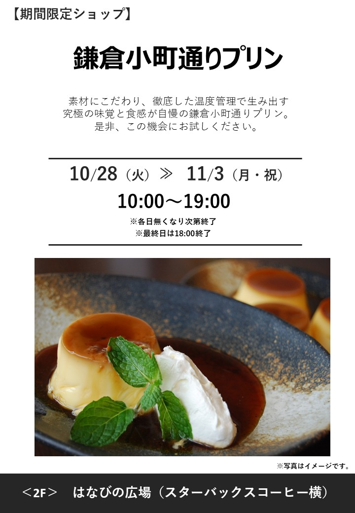 10月28日(火)~11月3日(月・祝)の期間 2階はなびの広場にて「鎌倉小町プリン」が期間限定でオープン!