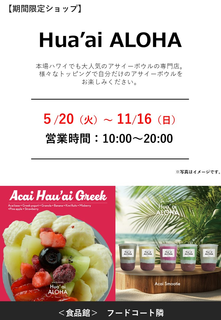 5月20日(火)~11月16日(日)、食品館 フードコート隣にて、「Hua'ai ALOHA」が期間限定でオープン!