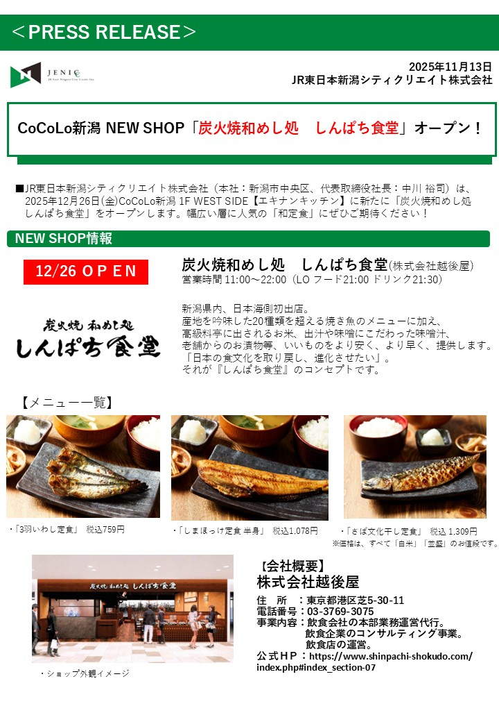 CoCoLo新潟ニュースリリース「炭火焼和めし処 しんぱち食堂」オープンのお知らせ