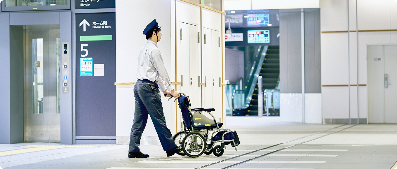 お身体が不自由なお客さまへのお声かけやサポートを行うほか、お忘れ物や各種お問合せへの対応を行っています。
